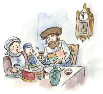 However, Reb Shmuel was not used to the heavy food or aged wine. By the end of the next day's meal, he was very, very tired. Reb Shmuel decided to nap, so he would have enough energy to make the second night's seder as enjoyable as the first. But he overslept.